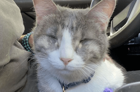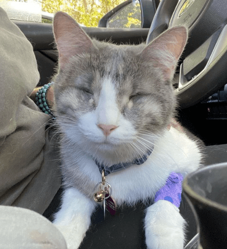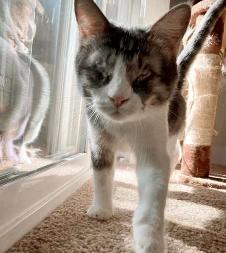 She would do best as the only cat as she canโt see and if the other cat hisses at her, she will stand her ground (probably since she was a feral / survivor in her younger days)
