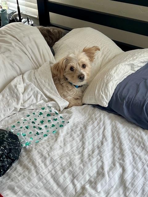 Benji is a lovable mixed breed with a low-shedding coat and a heart full of love. He’s got energy to spare when it’s playtime, but when it’s nap time? He’s the ultimate cuddle bug. He sleeps in his crate and has been learning to chill like a pro.