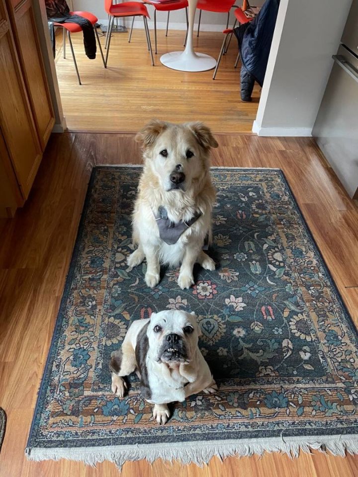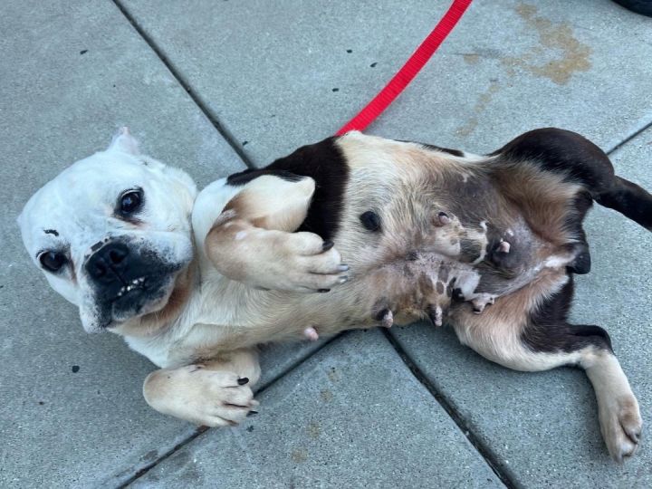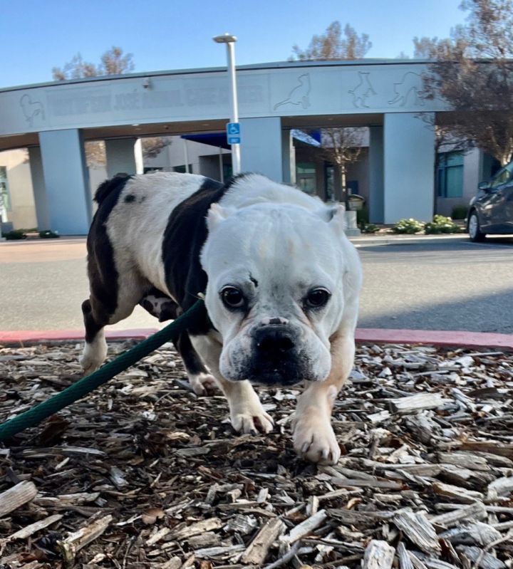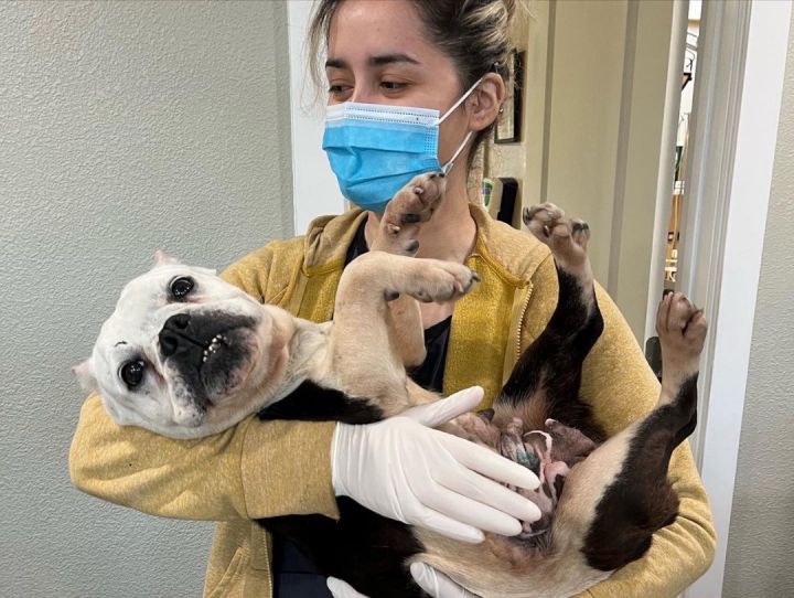 Unlike her namesake, this Frenchie mix is quiet and gentle. She rarely barks, and even her snore is easygoing – like the sound of waves breaking on the beach. Her favorite activity (apart from getting belly rubs) is snoozing in the sun, so you’ll hear those waves a lot! Harley has so much love to give that she will follow you from room to room, waiting patiently for her next chance to adore you. But be warned: this little genus is a master at tricking you out of treats and into cuddles! Although begging is beneath her dignity, she knows she’s cute and that it’s only a matter of time before you succumb to her “where’s my treat” face. Harley walks well on a leash, makes friends with everyone she meets (humans and animals), and uses a doggie door to potty outside. Although she is crate-trained, Harley’s prior life was as a breeding dog and she was constantly confined to a crate, so she’d prefer to be free to hang out next to you. Harley is guessed to be about 7 years old and weighs about 30 pounds. If you’re interested to meet Harley, we ask that you help us learn more about you/your household members by filling out our online application: http://www.tinyurl.com/AdoptMeNow