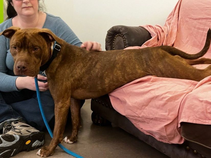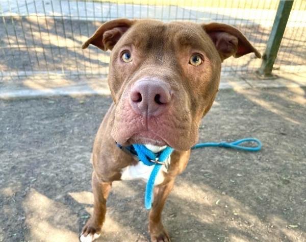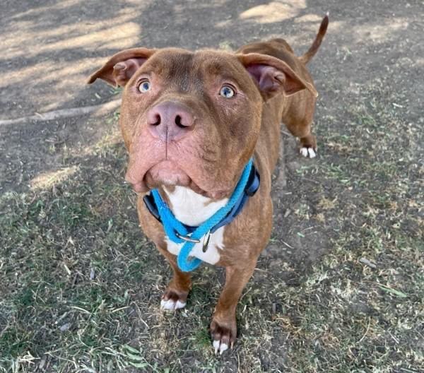 Makan is a handsome two-year-old pittie mix. People can’t help but admire his striking hazel eyes and silly ears! Makan looks to his humans for social cues; if you tell him that a person is safe, and that person approaches him calmly, Makan will offer a polite paw for his new friend to shake. For a really good treat, Makan may even give his new friend a nose boop or gentle thank-you kisses! You’ll know it’s true love if he drapes himself across a lap and looks back to say, “I’d like cuddles now, please.”