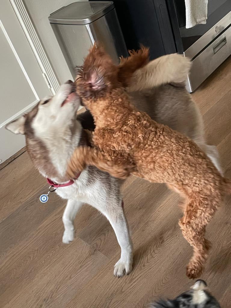 Noel gets a little separation anxiety when left alone, but is working on this in training. She loves toys (especially destroying stuffies!), so puzzles that challenge her brain may help her learn to appreciate solo time. Noel knows how to be quiet when asked, and even behaves for her baths! With continued positive training, she will shine.