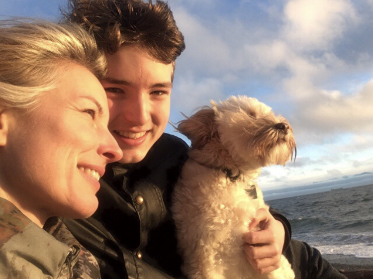 Remi is doing very well. We are loving B.C.! The toughest decision we have to make every day is: Where shall we go for a walk: in the woods, around a lake or by the sea? Remi continues to love sand beaches (especially on windy days) and chasing bunnies in the woods. He enjoys being off leash. He likes to explore but always keeps an eye on where I am and returns to my side right away when I call him. He continues to be very affectionate; and his joy in the morning is the greatest gift. He is popular with everyone and people often comment on what a calm dog he is. Here is a photo of him, my son Peter and me enjoying the sunset on Dallas Road.