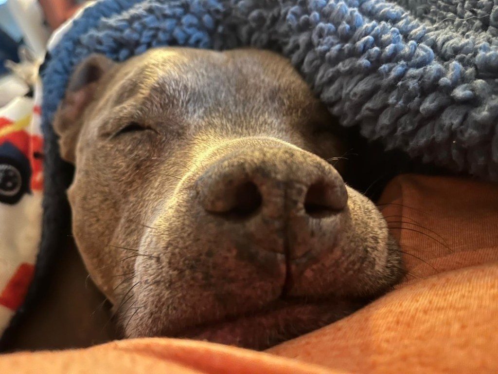 Samantha is a sweet senior pittie. As soon as you meet this cuddly couch potato, she will flop down for a belly rub or shove her head under your hand for ear scratches!