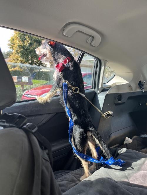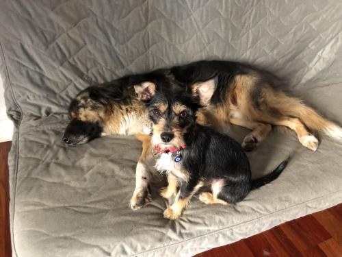 Our sweet mystery mix Sophie who is guessed to be 2 or so years old was found wandering the streets dragging a leash. Unfortunately she had no chip or tags, and nobody came looking for her. She also wasn’t spayed, and it looked like she may have recently had a litter. Sophie was so scared at the shelter and for the first couple of days at her foster home, but she has blossomed into a playful and energetic girl who loves to go for long walks and hikes. She follows her foster parents around and is always by their side.